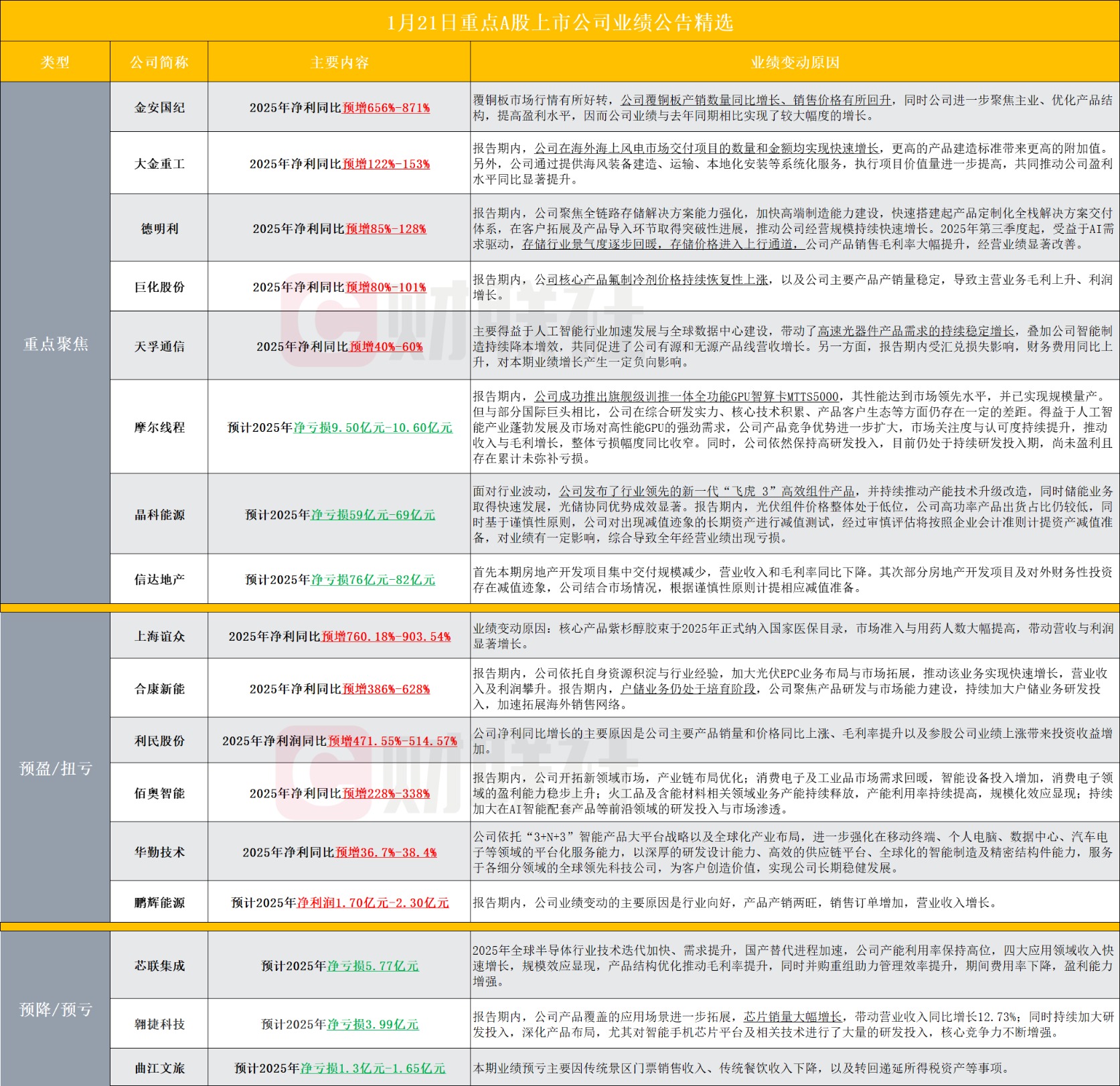 据财联社不完全统计,截至发稿,盘后包括金安国纪、大金重工、德明利、巨化股份、天孚通信、摩尔线程、晶科能源、信达地产、上海谊众、合康新能、利民股份、佰奥智能、华勤技术、鹏辉能源、芯联集成、翱捷科技、曲江文旅等多家A股上市公司发布2025年业绩预告。其中,天孚通信公告,2025年净利同比预增40%-60%,有源和无源产品线营收增长。摩尔线程公告,预计2025年净亏损9.5亿元-10.6亿元。