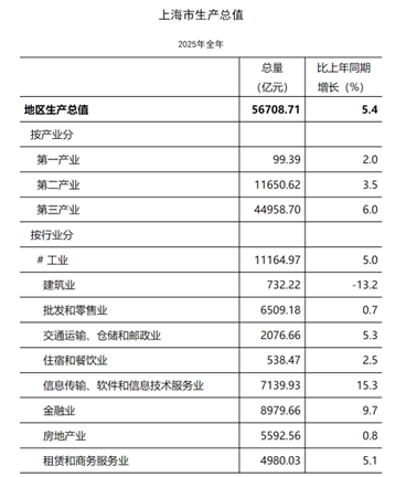 2025年,上海GDP达5.67万亿元,按不变价格计算,同比增长5.4%。这一增速不仅超额完成年初设定的5%增长目标,也跑赢了全国5.0%的平均增速。
