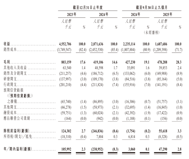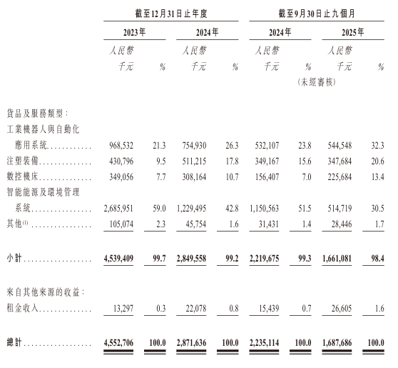 招股书显示,2023年、2024年及2025年前三季度,拓斯达的营业收入分别为人民币45.53亿、28.72亿和16.88亿元,对应的净利润分别为人民币1.06亿、-2.39亿和0.47亿元。
