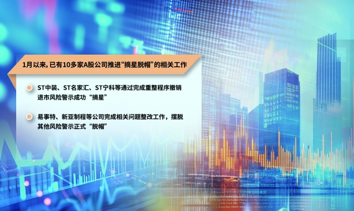 据上海证券报记者不完全统计,1月以来,已有10多家A股公司推进“摘星脱帽”的相关工作,既有ST中装、ST名家汇等公司通过完成重整程序撤销退市风险警示成功“摘星”,也有易事特、新亚制程等公司完成相关问题整改工作,摆脱其他风险警示正式“脱帽”。