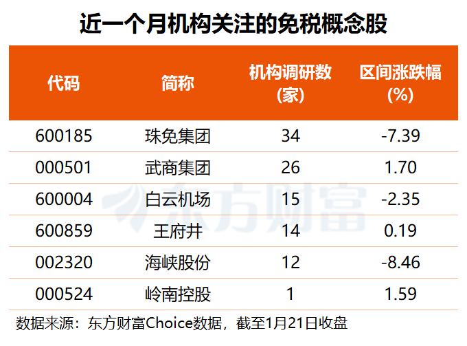机构关注度方面,近一个月,共有6只免税概念股获得机构调研,珠免集团共获34家机构关注,武商集团获26家机构集中调研,王府井、白云机场、海峡股份的机构调研数均超10家。