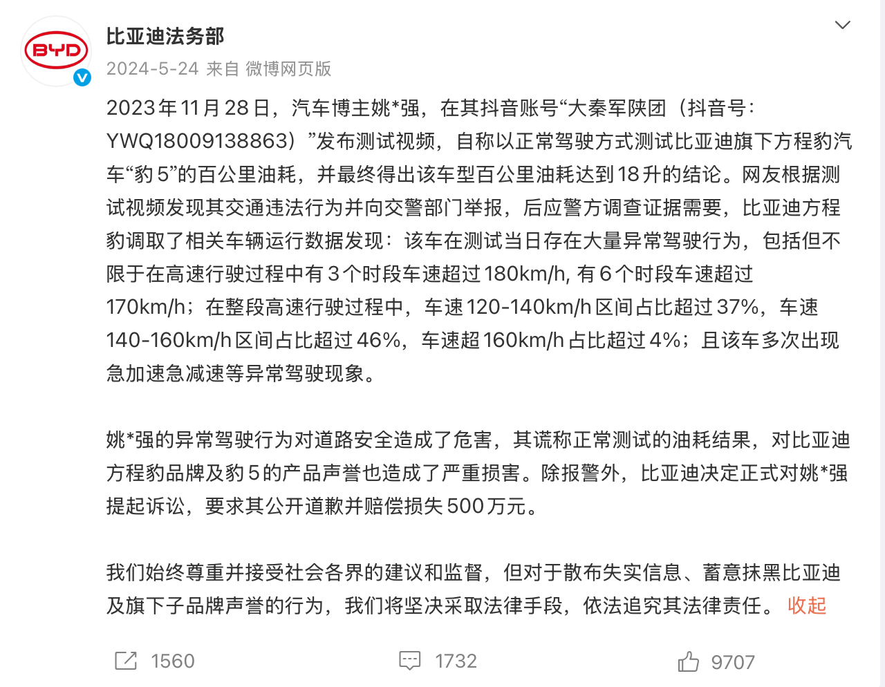 2024年5月24日,比亚迪法务部发文称,决定正式对汽车博主“姚*强”提起诉讼,要求其公开道歉并赔偿损失500万元。