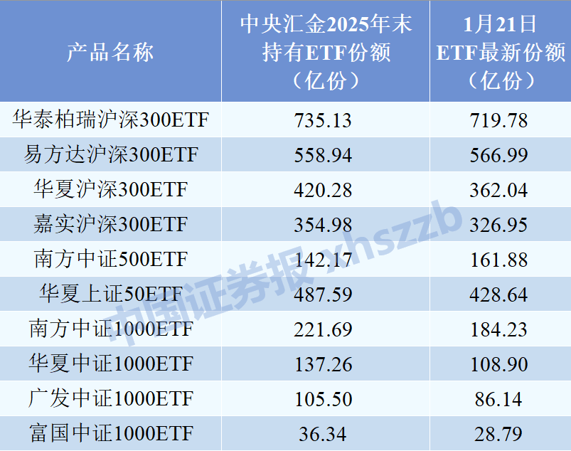 以龙头宽基ETF为例,截至1月21日,华泰柏瑞沪深300ETF、华夏沪深300ETF、嘉实沪深300ETF、华夏上证50ETF的基金份额数量分别为719.78亿份、362.04亿份、326.95亿份、428.64亿份,目前均已低于2025年末中央汇金持有的735.13亿份、420.28亿份、354.98亿份、487.59亿份。