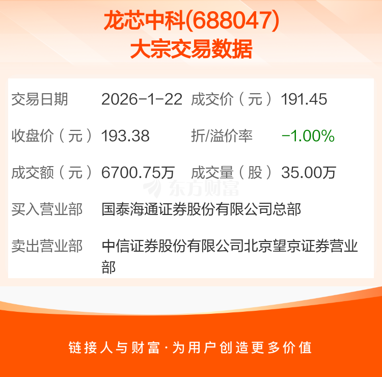 2026年1月22日,龙芯中科发生1笔大宗交易,共成交35.00万股,成交金额6700.75万元,占其流通市值比例为0.09%。