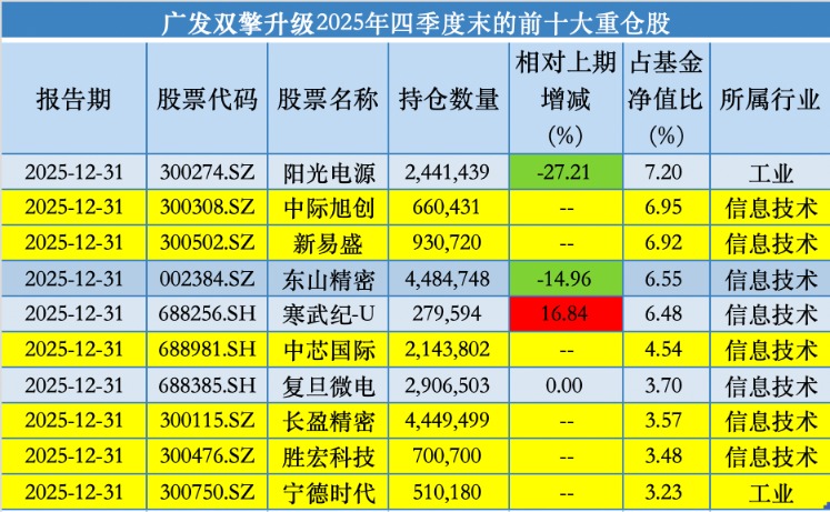 以广发双擎升级为例,截至2025年四季度末,该基金的前十大重仓股分别为阳光电源(300274.SZ)、中际旭创(300308.SZ)、新易盛(300502.SZ)、东山精密(002384.SZ)、寒武纪(688256.SH)、中芯国际(688981.SH)、复旦微电(688385.SH)、长盈精密(300115.SZ)、胜宏科技(300476.SZ)、宁德时代(300750.SZ)。