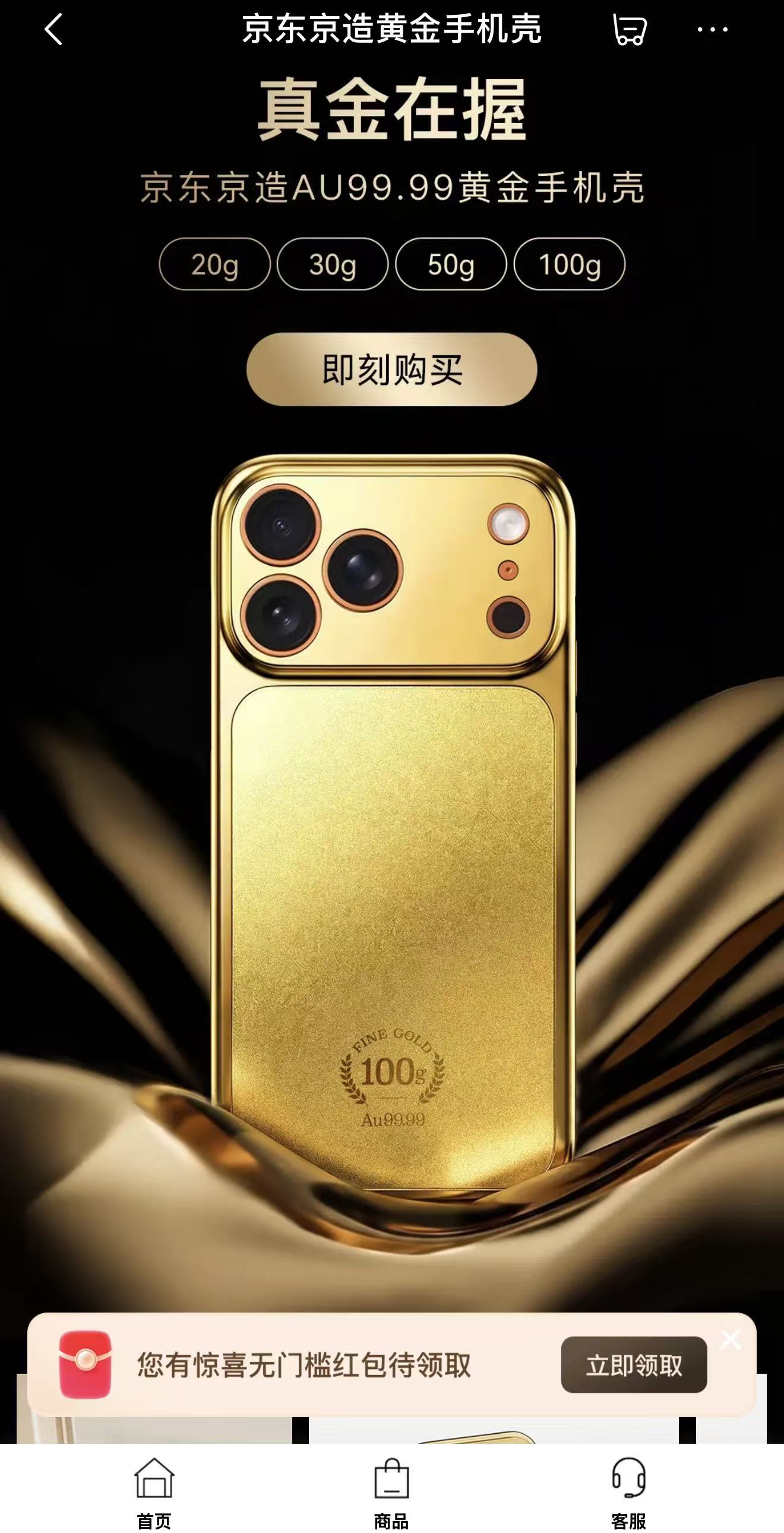 界面新闻获悉,近日,京东平台正式推出黄金手机壳,最低11299元起,最高达112299元。