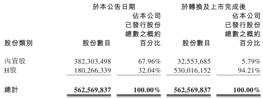 公告中提到,转换及上市完成后,公司股权结构将发生变化。具体如下: