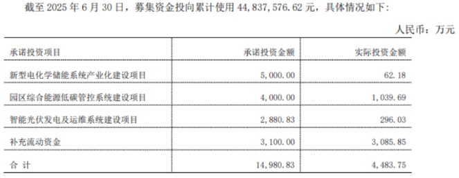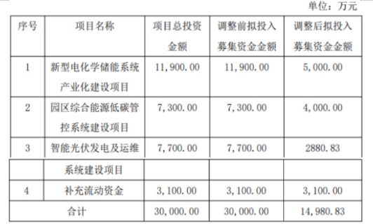 1.5亿元募资被分配至四大项目:低碳管控项目拟投4000万元、新型电化学储能系统产业化建设项目(下称“新型储能项目”)拟投5000万元、智能光伏发电及运维系统建设项目(下称“光伏发电项目”)拟投2880.83万元,剩余3100万元补流,前三大项目,均于2022年7月立项,原计划于2026年1月19日达到预定可使用状态。