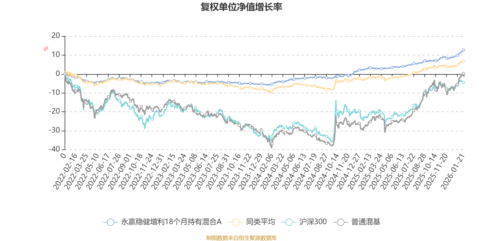 截至1月21日,永赢稳健增利18个月持有混合A近三个月复权单位净值增长率为4.93%,位于同类可比基金72/629;近半年复权单位净值增长率为6.80%,位于同类可比基金165/629;近一年复权单位净值增长率为9.69%,位于同类可比基金213/626;近三年复权单位净值增长率为16.65%,位于同类可比基金145/564。