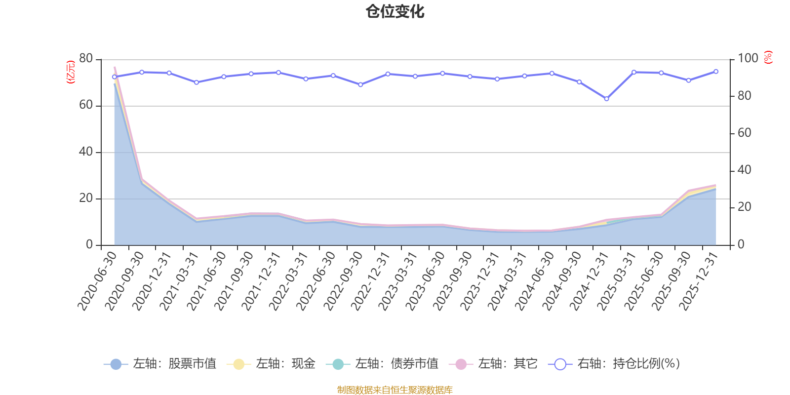 据定期报告数据统计,近三年平均股票仓位为90.09%,同类平均为86.12%。2025年末基金达到93.42%的最高仓位,2024年末最低,为78.75%。