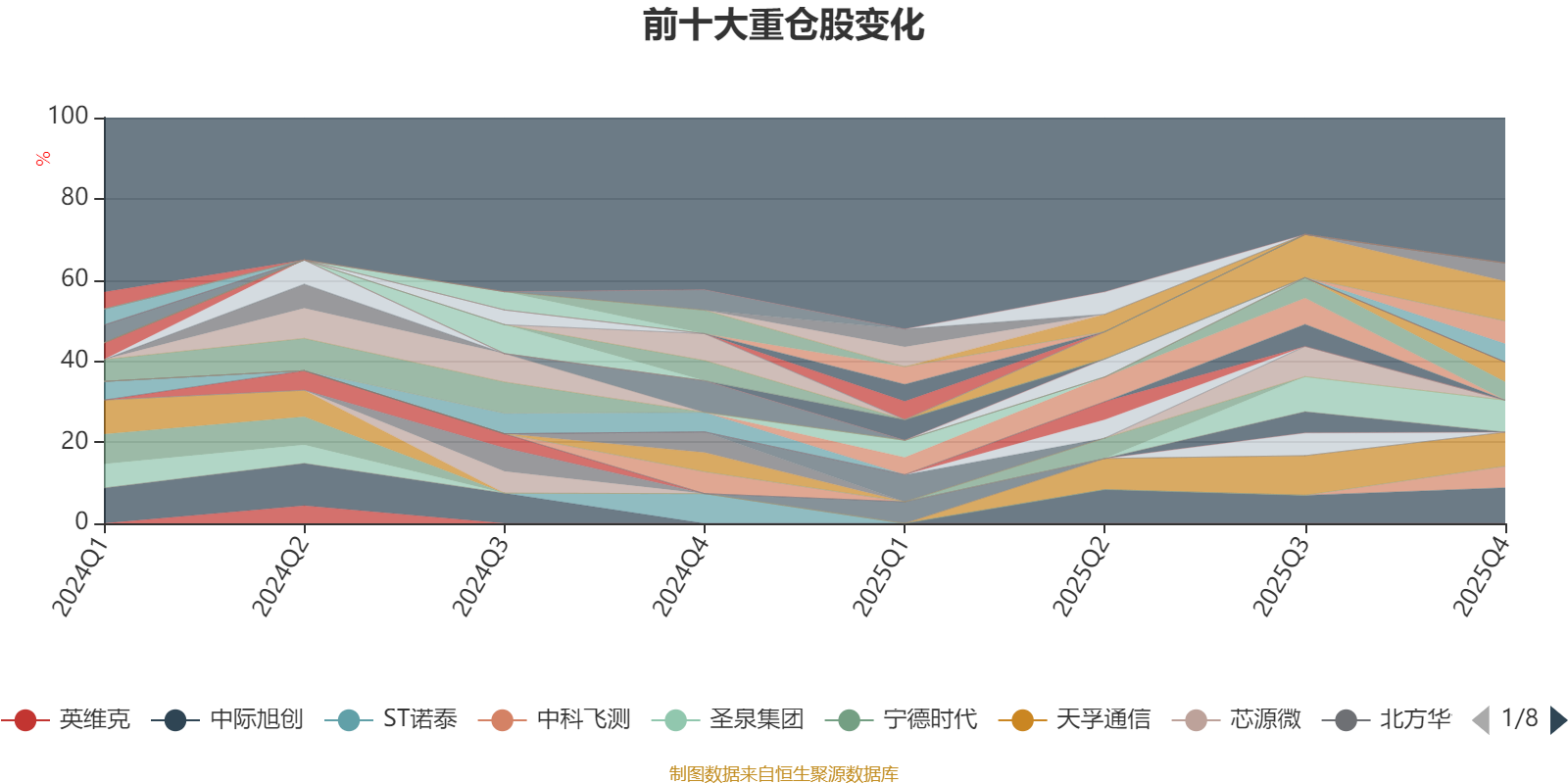 截至2025年四季度末,基金十大重仓股分别是源杰科技、中际旭创、天孚通信、生益科技、德明利、中科飞测、仕佳光子、沪电股份、江波龙、北京君正。