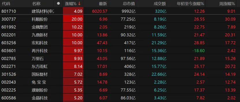 今日建筑材料板块涨势领先全场,科顺股份“20cm”涨停,金隅集团、九鼎新材、宏和科技、再升科技、万里石涨停。