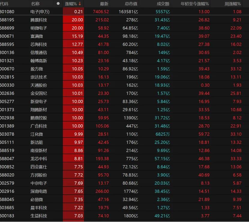 电子板块微红,但有11只个股涨停,腾景科技、明微电子“20cm”涨停,盈方微、崇达技术、天通股份、金安国纪、新亚电子均涨停。