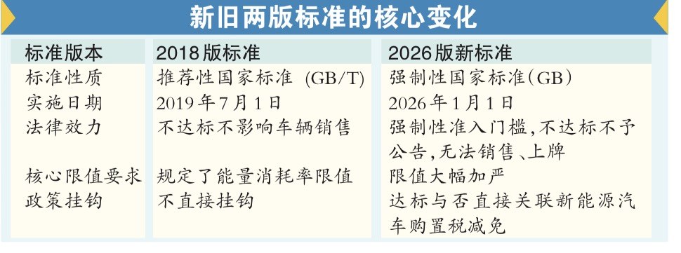纯电动汽车实现更长续航容易,想“省电”却很难?一根新的准绳在2026年第一天落下。从今年1月1日起,《电动汽车能量消耗量限值第1部分:乘用车》(GB36980.1—2025)国家标准正式生效。该标准提出了不同车重下的电耗限值,较上一版推荐性标准加严约11%。