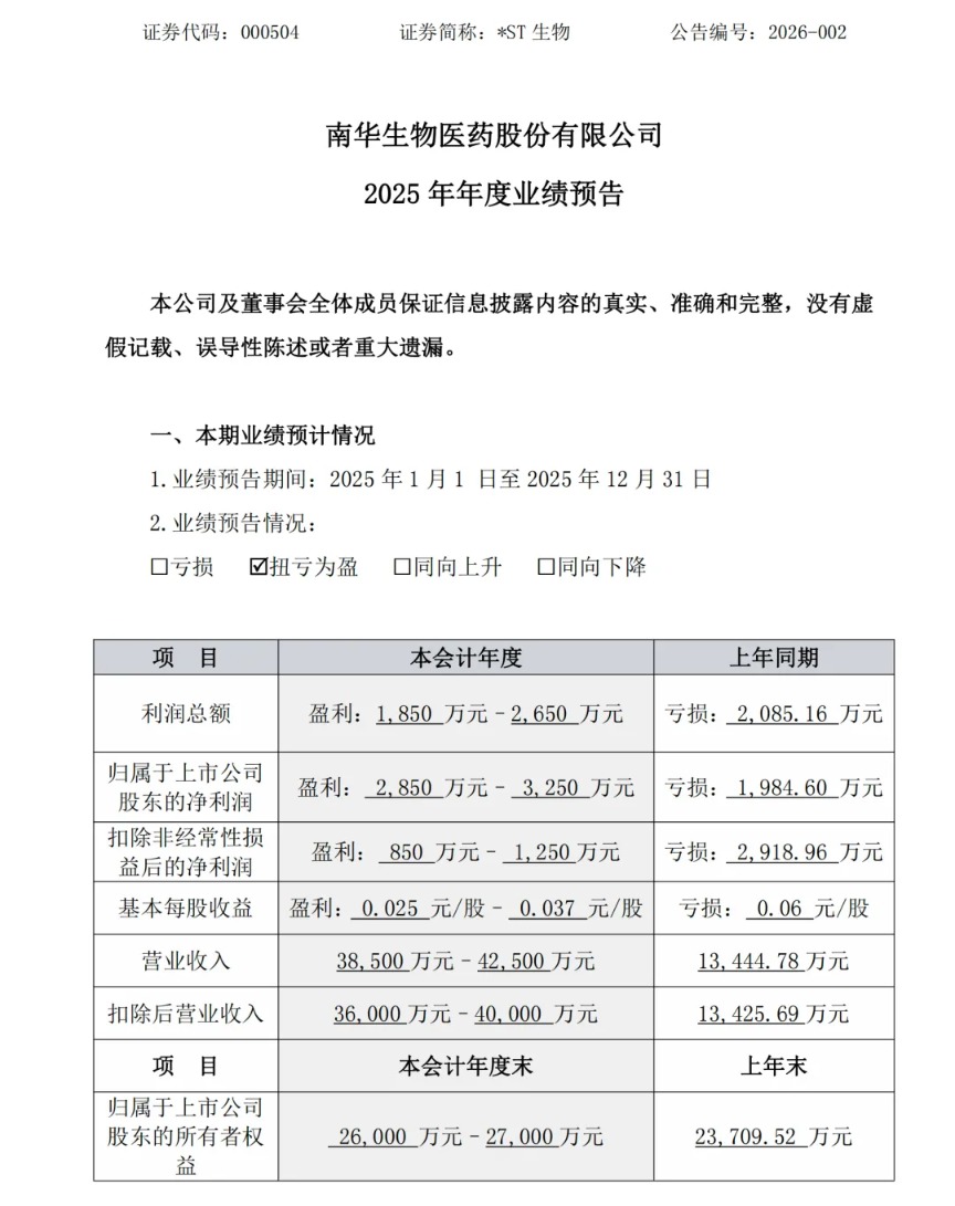 *ST生物同时预计,2025年利润总额为1850万元至2650万元,归属于上市公司股东的净利润为2850万元至3250万元,扣除非经常性损益后的净利润850万元至1250万元,三项指标全部实现扭亏为盈。
