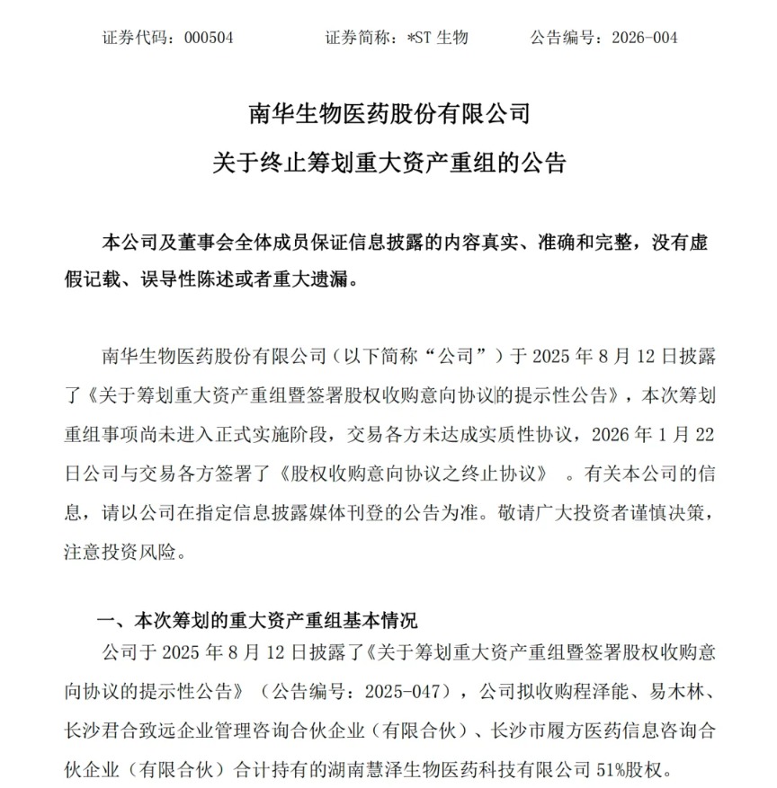在预告2025年业绩回暖的同时,*ST生物公告称,终止筹划重大资产重组。