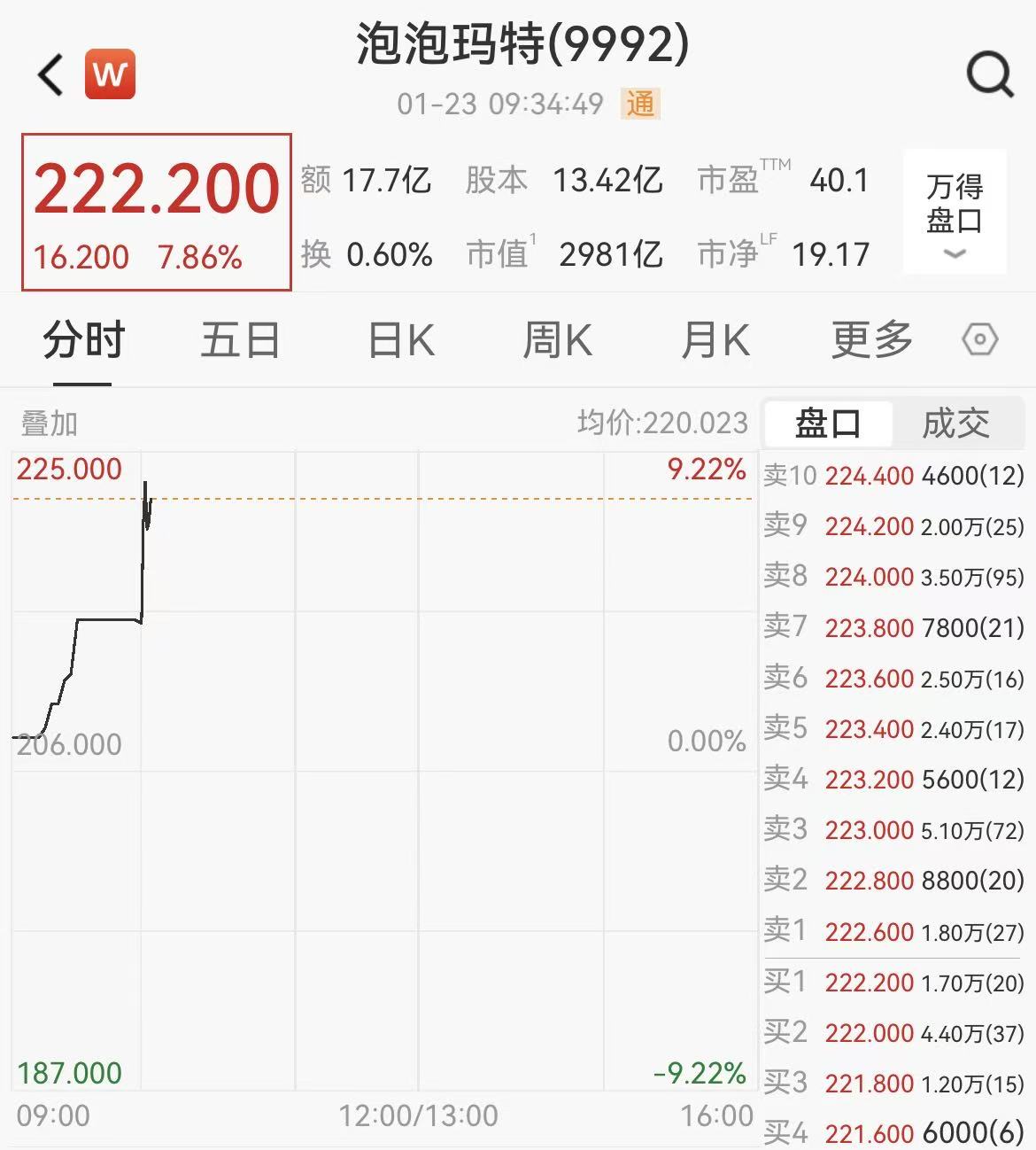 产品爆火也传导至资本市场。1月23日上午,截至发稿,泡泡玛特(09992.HK)大涨超7%,现报222.2港元/股,市值2981亿港元。另外,值得一提的是,1月21日晚间,泡泡玛特发布公告称,公司当日以9649万港元回购公司50万股股份,回购价格为191.1港元至194.9港元。这是公司本周内第二次回购股份,累计回购金额近3.5亿港元。