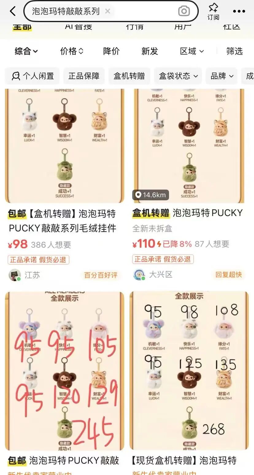 在某电商平台上潮玩店铺售卖的泡泡玛特毕奇敲敲毛绒挂件隐藏款售价为327元左右,溢价率高达230%。此外,二手交易平台上该款标价在245元及以上。