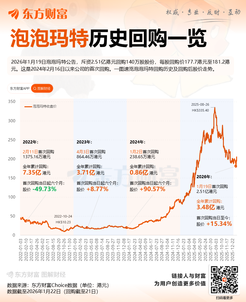 在产品热度攀升的同时,公司通过资本运作强化市场信心。1月21日晚间公告显示,泡泡玛特当日斥资9649万港元回购50万股股份,回购价区间为191.1至194.9港元。此举为本周内第二次回购,累计金额近3.5亿港元。密集的回购行动表明管理层对当前估值的认可及对未来增长的坚定预期。