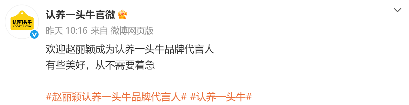 1月22日,认养一头牛在官方微博宣布,赵丽颖成为认养一头牛品牌代言人。