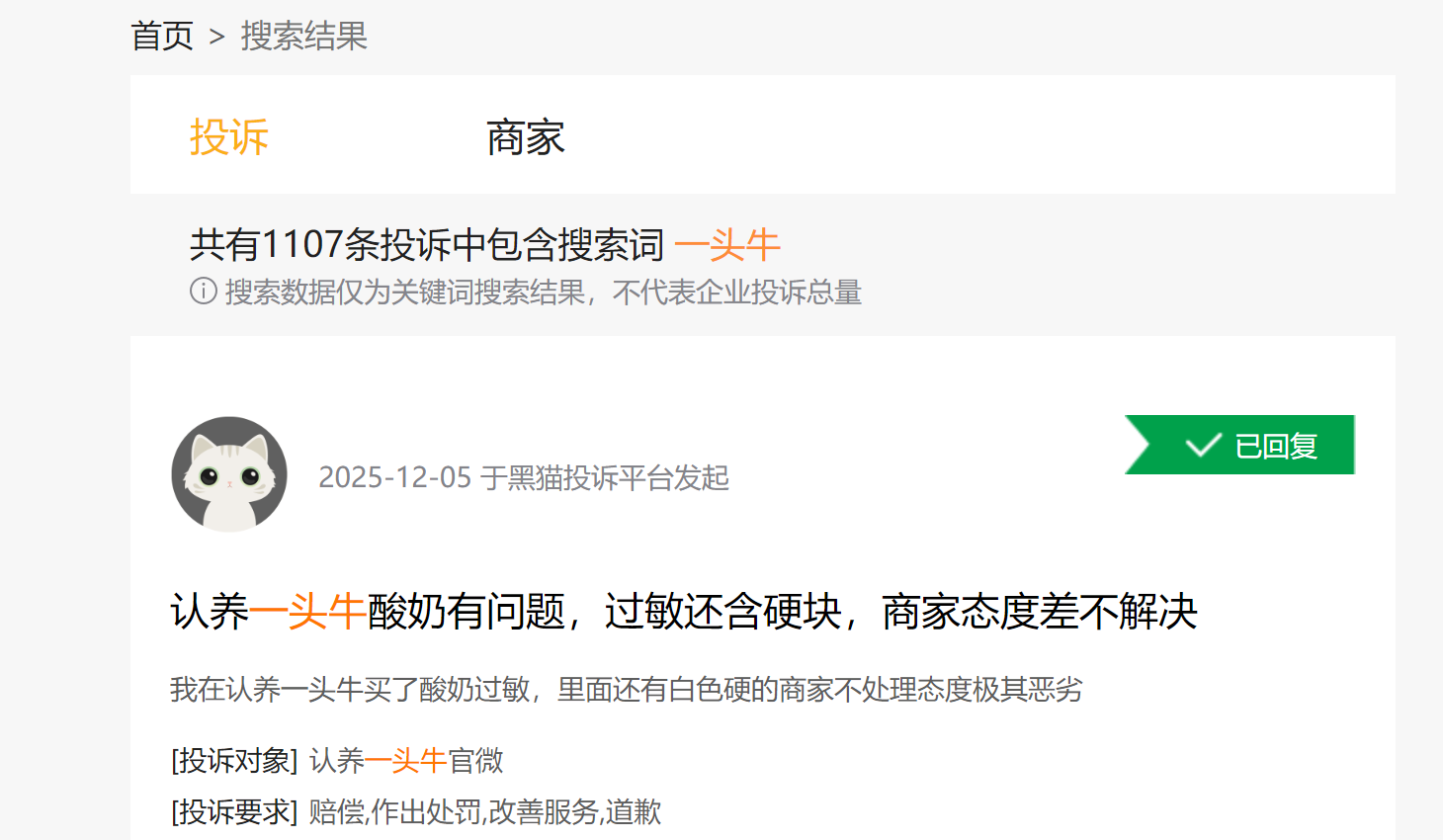 在黑猫投诉平台上,消费者对包含“一头牛”的投诉已经超过1100条,问题恰恰集中在产品质量上。有消费者称在电商平台买到了过期纯牛奶,但商家不给处理退款。