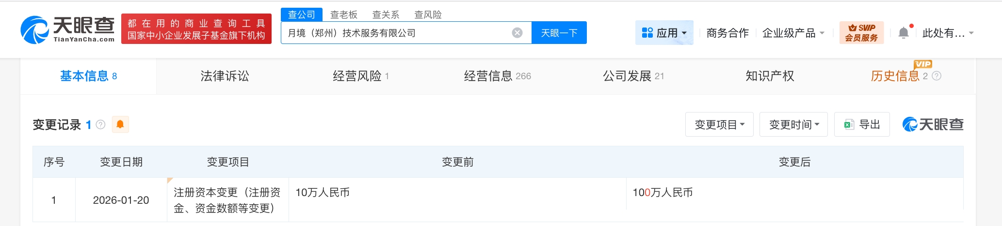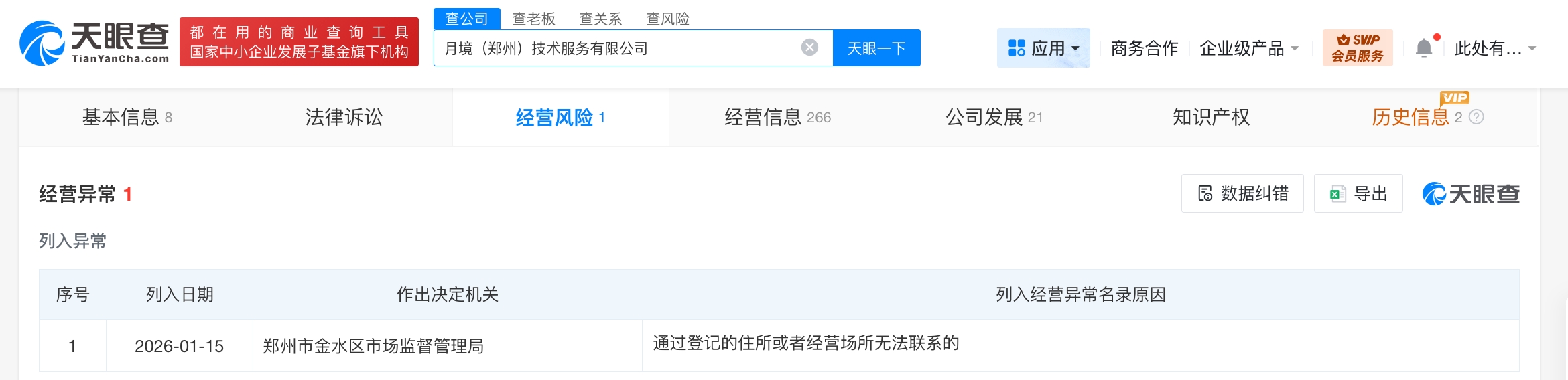 天眼查天眼风险信息显示,近日,月境(郑州)技术服务有限公司因通过登记的住所或者经营场所无法联系,被郑州市金水区市场监督管理局列入经营异常名录。此外,该公司注册资本由10万人民币增至100万人民币,增幅900%。