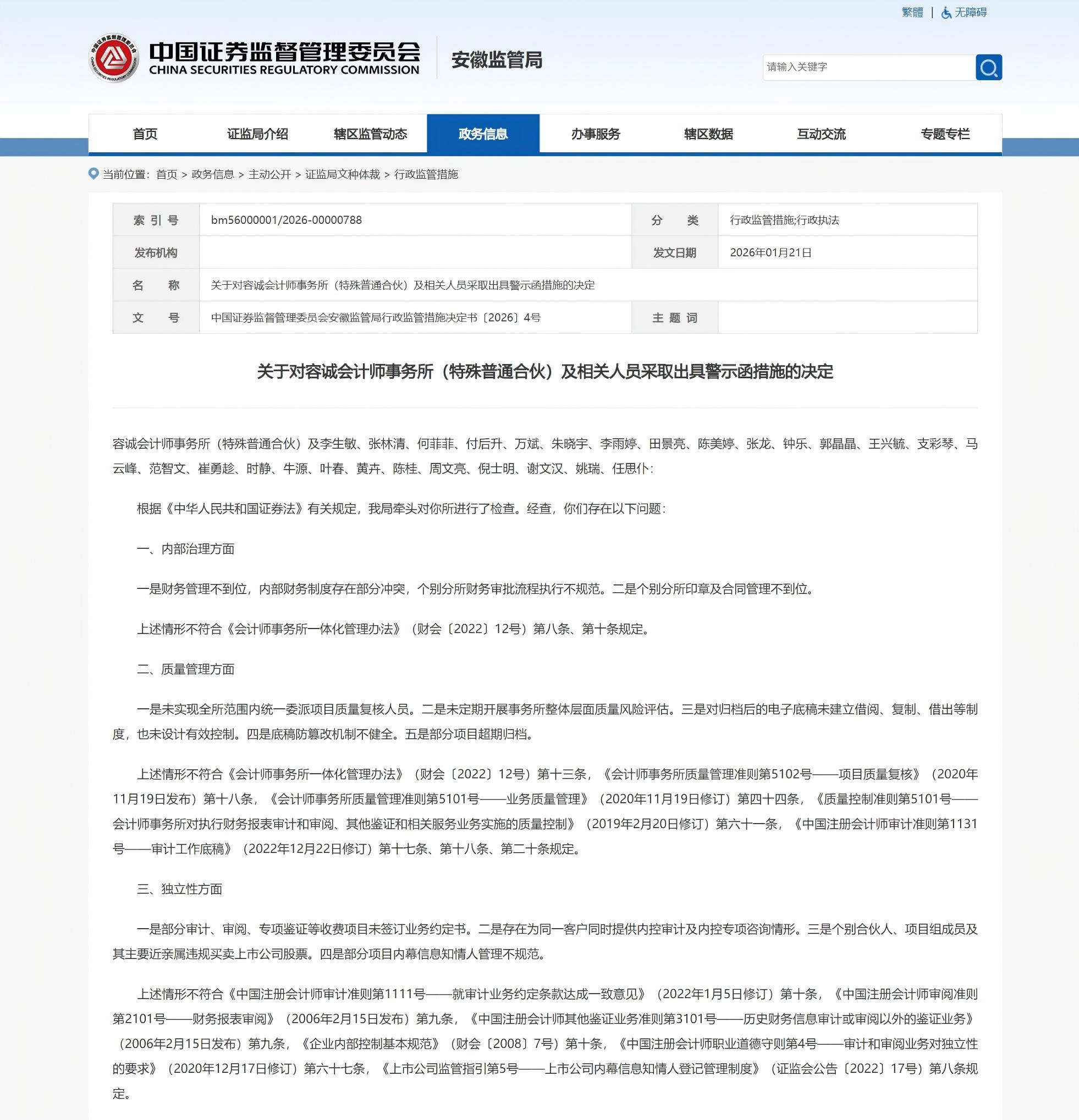 安徽证监局日前公布行政监管措施决定,对头部会所容诚会计师事务所(特殊普通合伙)及27名注册会计师采取出具警示函的监督管理措施。这一处罚规模在业内较为罕见。从警示函看,其在内部治理、质量管理、独立性和项目执业质量等多个环节存在显著违规。就在去年,因在红相股份年度审计业务未勤勉尽责,该所收到2306万元的巨额罚单。