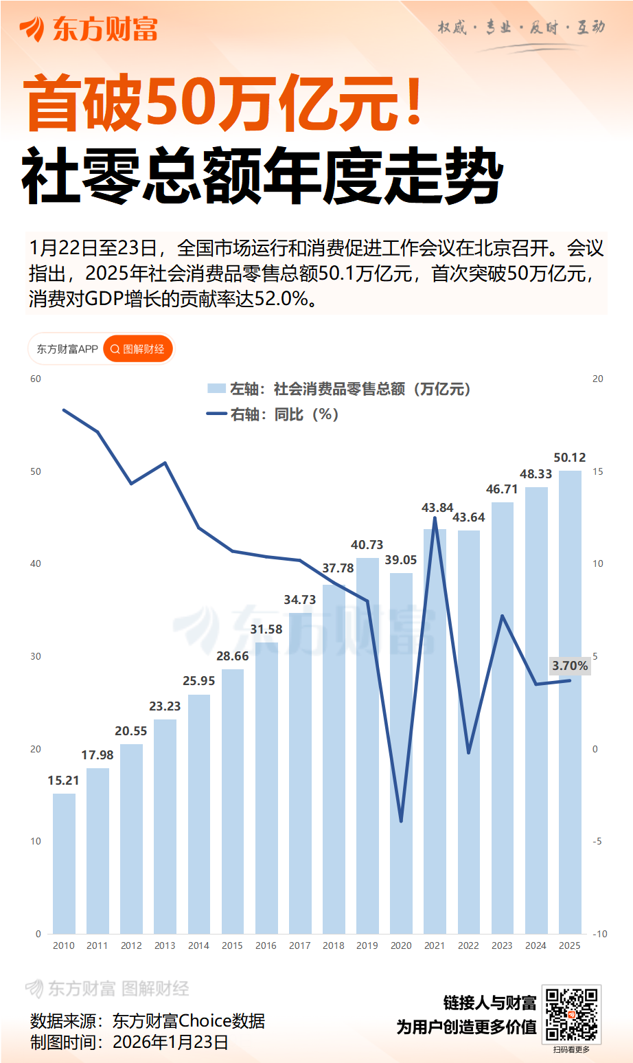 会议指出,2025年,各级商务主管部门认真贯彻落实党中央、国务院决策部署,大力提振消费,持续释放消费潜力。全年社会消费品零售总额50.1万亿元,首次突破50万亿元。消费对GDP增长的贡献率达52.0%,持续发挥经济发展主引擎作用。商品消费较快增长,以旧换新相关产品销售额2.61万亿元,惠及3.66亿人次。服务消费提质扩容,服务零售额增长5.5%。新型消费快速发展,实物商品网上零售额增长5.2%。离境退税高速增长,“购在中国”成为热词。