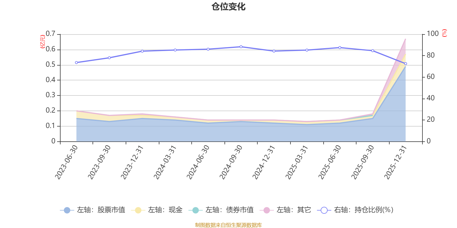 据定期报告数据统计,成立以来平均股票仓位为82.69%,同类平均为84.04%。2024年三季度末基金达到88.32%的最高仓位,2025年末最低,为72.54%。