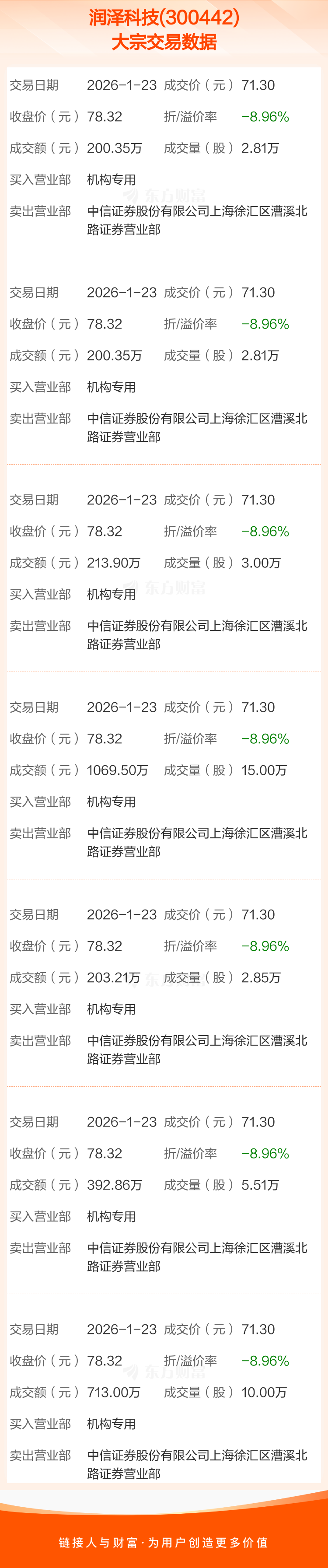 2026年1月23日,润泽科技发生7笔大宗交易,共成交41.98万股,成交金额2993.17万元,占其流通市值比例为0.02%。