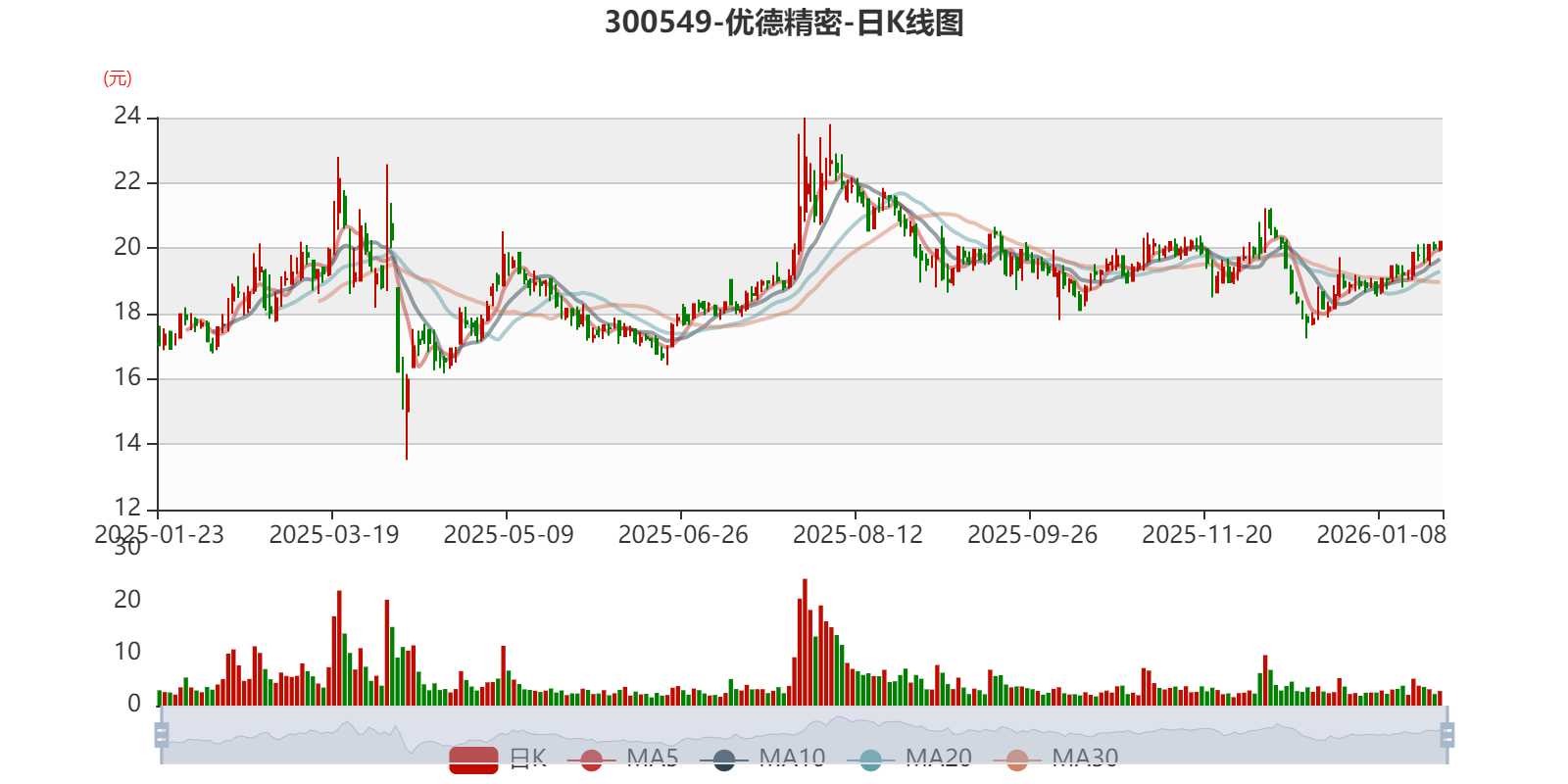 中证智能财讯优德精密(300549)1月23日晚间披露2025年度业绩预告,预计2025年营业收入同比下降9%;归母净利润720万元至920万元,同比下降32.84%-47.44%;扣非净利润预计160万元-220万元,同比下降75.82%-82.42%。以1月23日收盘价计算,优德精密目前市盈率(TTM)约为292.77倍-374.09倍,市净率(LF)约4.88倍,市销率(TTM)约8倍。