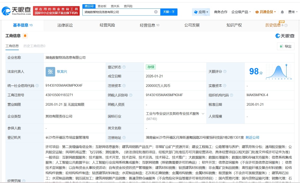 南方财经1月23日电,天眼查App显示,近日,湖南数智物流信息有限公司成立,法定代表人为张龙兴,注册资本20亿人民币,经营范围包括第二类增值电信业务、互联网信息服务、建筑用钢筋产品生产、非煤矿山矿产资源开采等,由现代投资(000900)、湖南省高速公路集团有限公司、湖南轨道交通控股集团有限公司等共同持股。