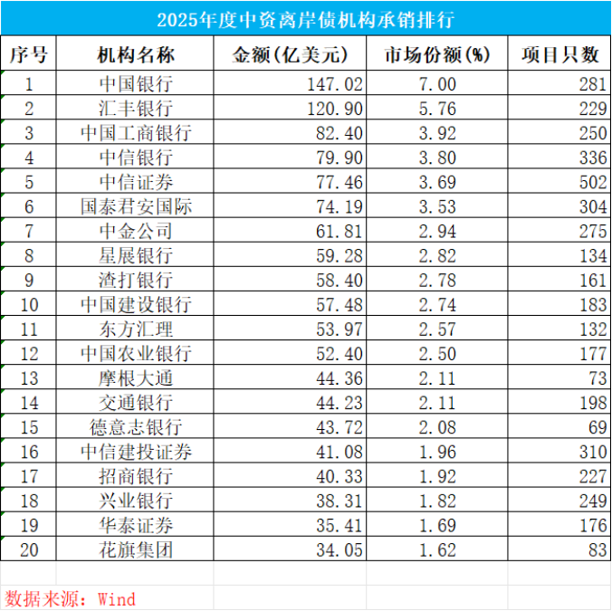 该市场国际化程度高,承销格局呈现“中外机构同台、份额相对分散、银行券商各具优势”的特点。其中,中国银行以147.02亿美元的承销额及7.00%的市场份额位居第一,但领先优势并不显著。汇丰银行、工商银行、中信银行等机构紧随其后,前四名合计份额约20.48%,反映出市场并未被少数机构垄断。