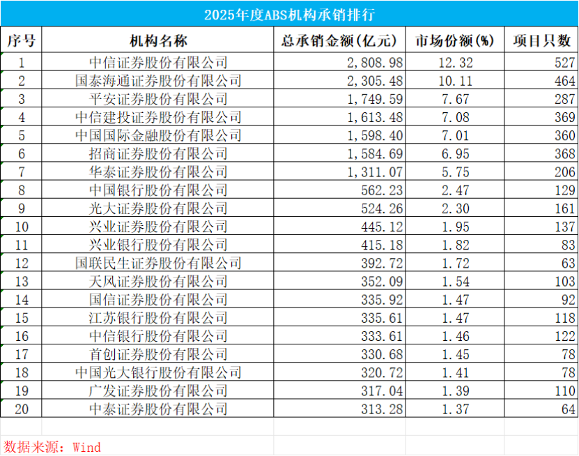 ABS市场呈现“头部集中、券商主导、银行参与”的特点。中信证券以2808.98亿元承销额和12.32%的份额位居榜首。国泰海通证券、平安证券、中信建投证券、中金公司及招商证券共同构成市场核心力量,前六家合计份额超5成。8-20名的队列里,则出现了中国银行、兴业银行等银行机构,显示出其积极参与。