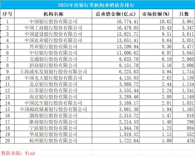银行机构之间,2025年债券承销市场的头部效应显著。中国银行以总承销金额超16万亿元的巨大业务体量位列第一,市场份额超10%。工商银行、建设银行、农业银行以及股份制银行中的兴业银行、中信银行紧随其后,其年度债券承销规模均超过10万亿元。业务活跃度方面,前6名银行承销债券只数均逾3000只。仅前四家国有大行合计市场份额已近40%,地位稳固。