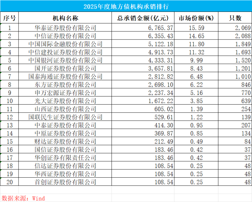 地方债的承销呈现高度头部集中态势。华泰证券以6765.37亿元承销额和15.59%的份额位居第一,中信证券以14.65%的份额紧随其后,两者合计约占三成市场。中金公司、中信建投证券和中国银河证券分列第三至第五。前五家机构合计市场份额超过63%。