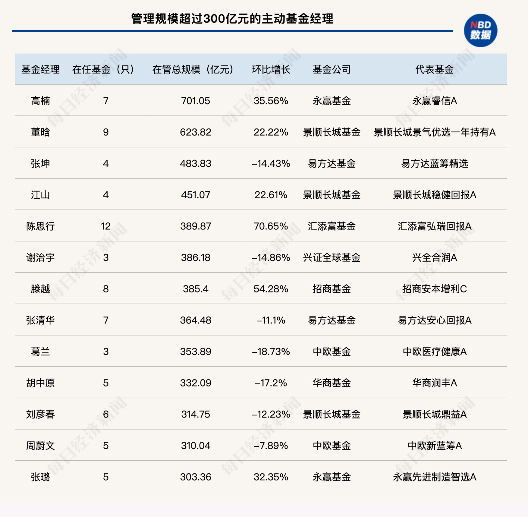 要说明的是,其中不少基金经理都有合管的情况,有的是合管权益类产品,有的则是合管二级债基或偏债混合基金中的权益投资部分,并不是单人就管理了这么大的规模。但我们在统计时都按Wind“在管基金总规模”口径来完成。