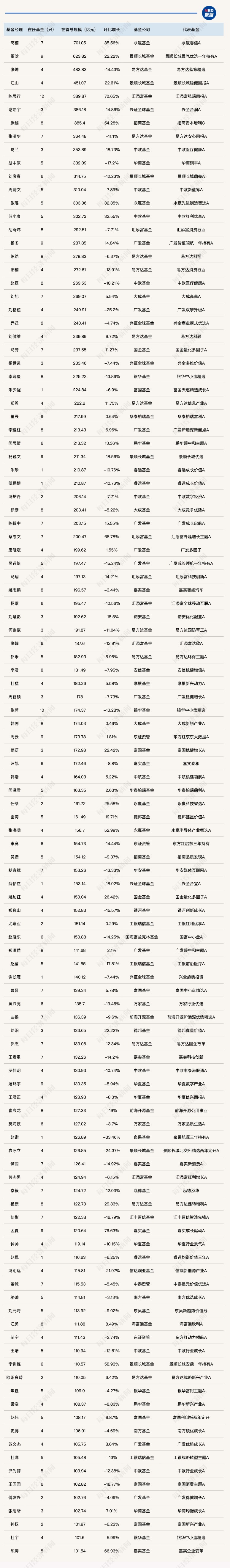 值得关注的是,普通投资者耳熟能详的知名基金经理可能因为规模缩水而排名下降,甚至退出“百亿基金经理”的行列。与此同时,有一批业绩突出的基金经理实现规模快速跃升,已然开始领跑市场。