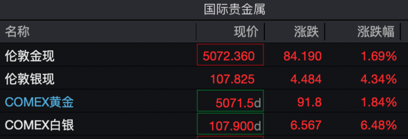 消息面上,金银价格继续上行。今日早间,国际黄金期现价格均突破5000美元/盎司,截至发稿,现货黄金报5072.36美元/盎司,COMEX黄金报5071.5美元/盎司。现货白银报107.825美元/盎司,COMEX白银报107.9美元/盎司,白银期现盘中均突破109美元/盎司。高盛最新报告将今年底黄金价格预测由每盎司4900美元上调至5400美元,因私人投资者及央行的需求不断增强。高盛预计,今年各国央行每月将购买60吨黄金,同时随着美联储降息,ETF所购买的黄金规模也会增加,进一步推升估值。