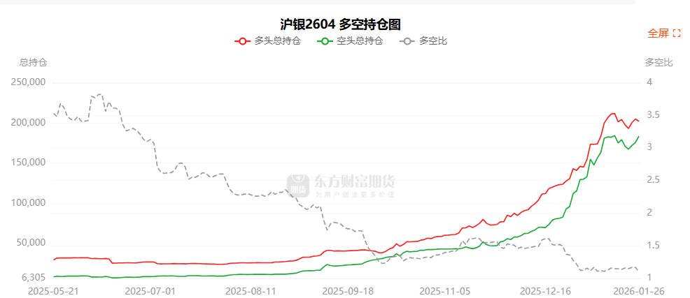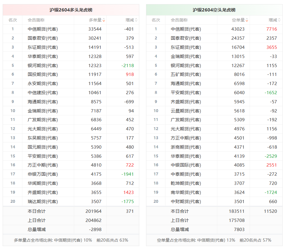 总体而言,沪银2604合约今日增仓上行,多空持仓排名前20席中,多方呈退场态势,空方呈进场态势。