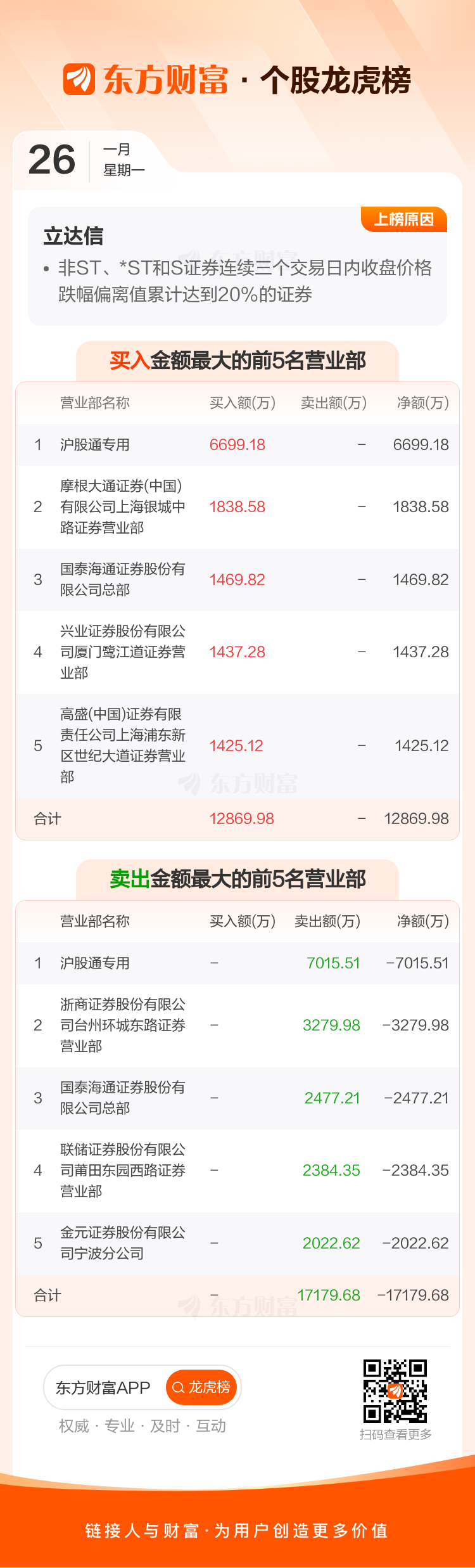 交易所2026年1月26日公布的交易公开信息显示,立达信因成为非ST、*ST和S证券连续三个交易日内收盘价格跌幅偏离值累计达到20%的证券上榜。立达信当日收报21.51元,涨跌幅-1.83%,换手率2.59%,成交额2.79亿。异常期间1月22日至1月26日,期间涨幅-20.04%,累计偏离值-20.41%,区间成交额11.07亿。