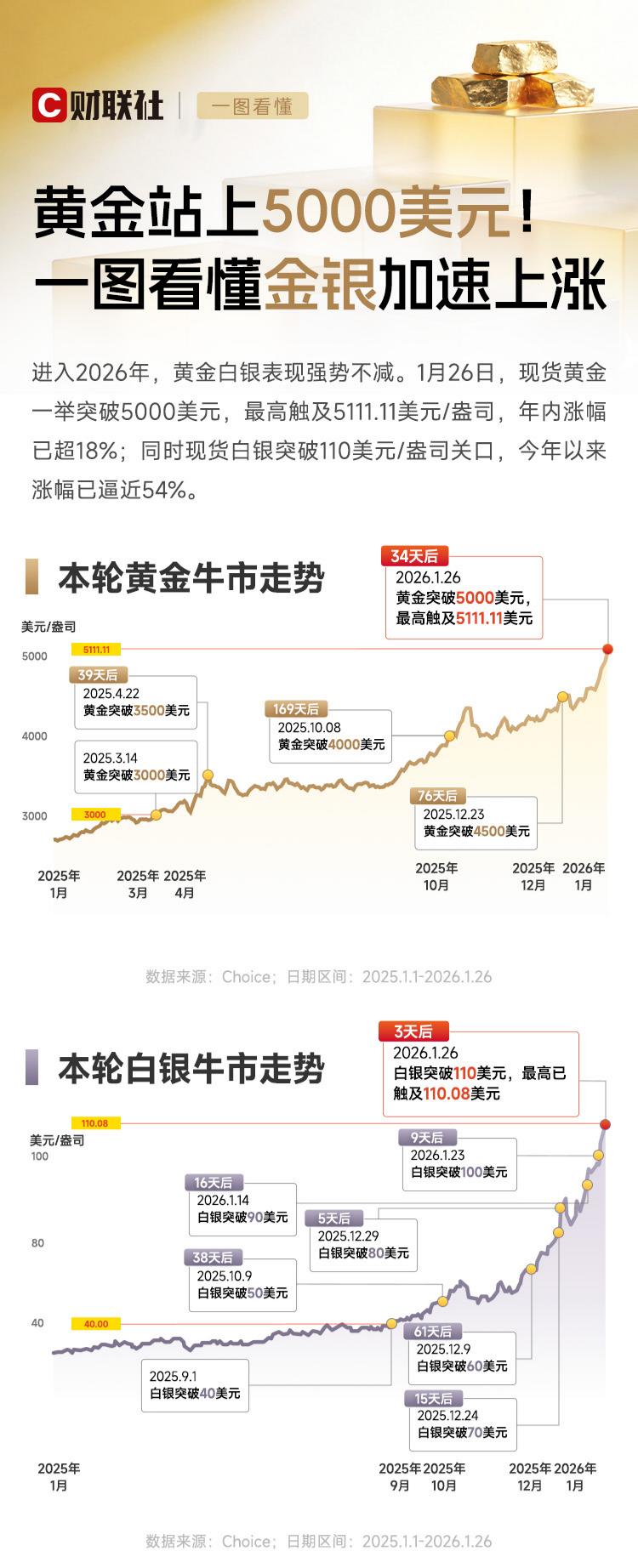 进入2026年还不足一个月,现货黄金已涨超18%,逼近5100美元/盎司;现货白银则在1月连破90、100、110美元三道关口,年内涨幅近54%。