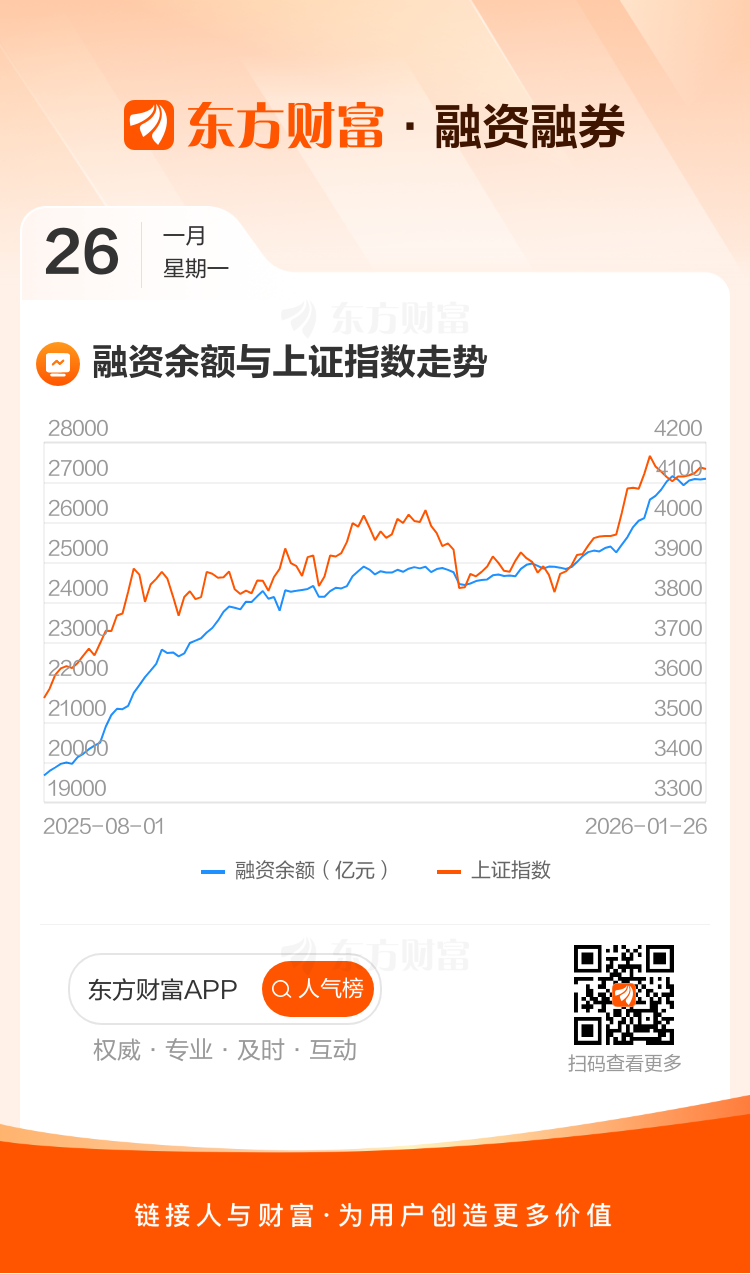 01月26日A股三大指数集体收跌,杠杆资金呈净买入之势,当天融资余额2.71万亿,较上一交易日增加18.81亿。