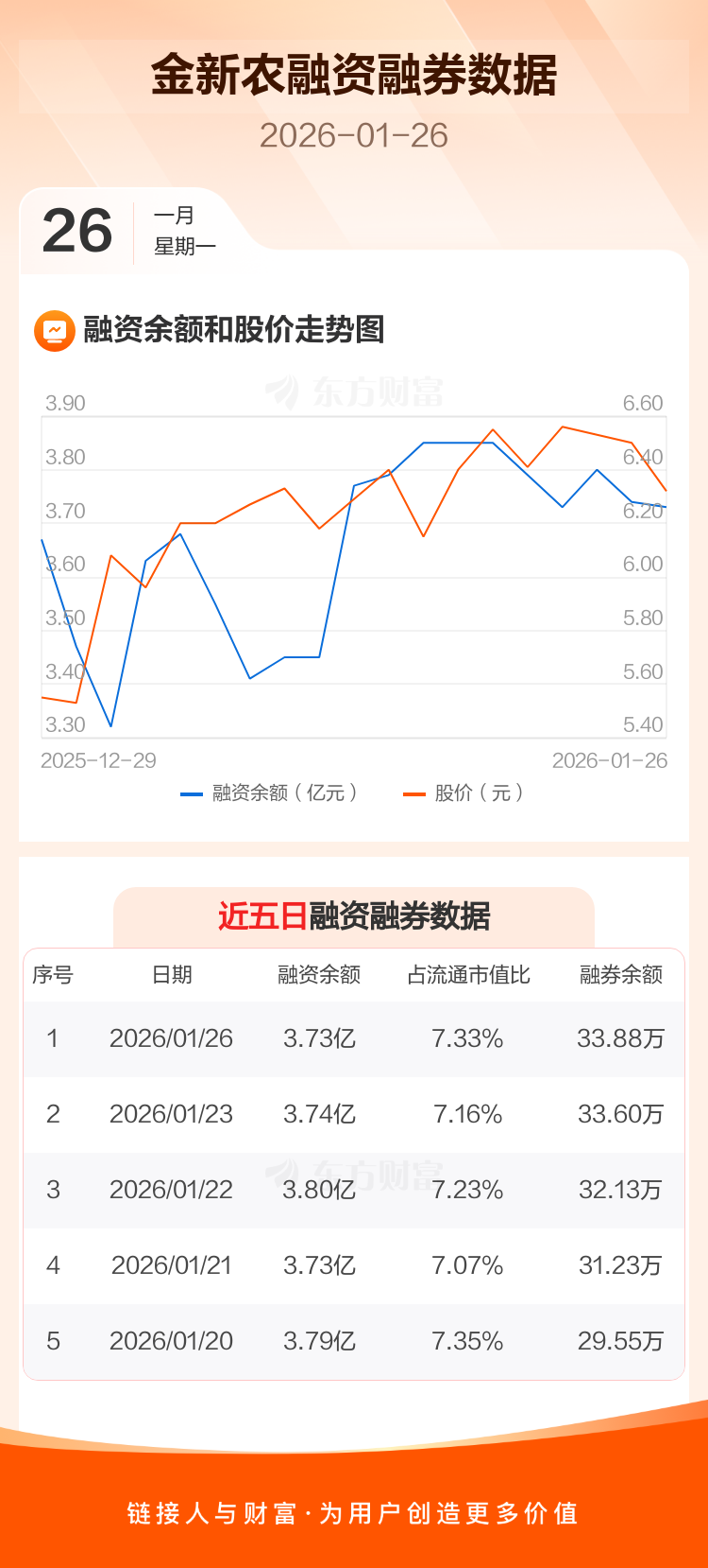 交易所最新数据显示,金新农于2026年1月26日获融资买入2754.05万元,融资偿还2911.08万元,当日融资净偿还157.03万元。目前,该股融资余额3.73亿,占流通市值比例为7.33%。