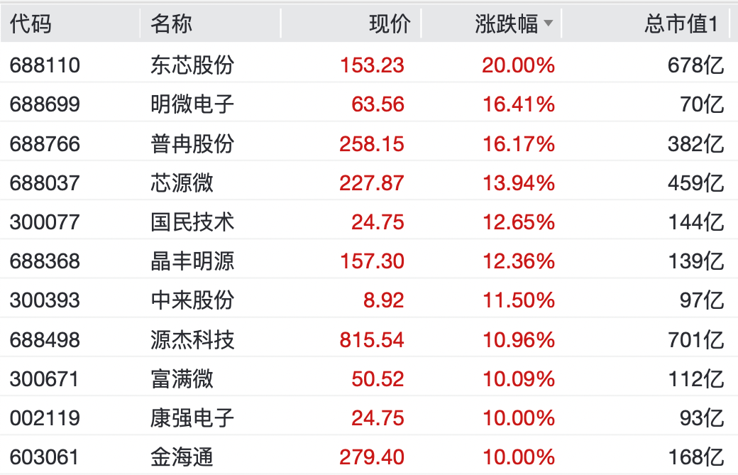 半导体板块方面,东芯股份录得20cm涨停,康强电子、金海通录得10cm涨停,明微电子、普冉股份均涨超16%,芯源微、国民技术、晶丰明源等涨超10%。