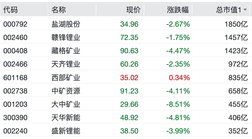 个股方面,天际股份跌超9%,华盛锂电跌近8%,多氟多跌超7%,盐湖股份、赣锋锂业、天齐锂业等纷纷下跌。