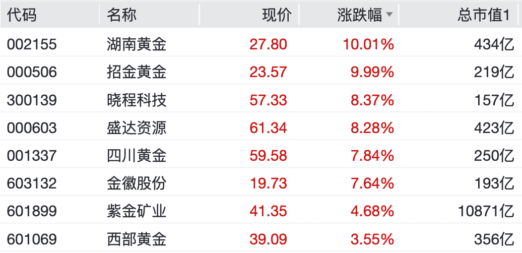 个股方面,湖南黄金、招金黄金再次涨停,均录得2连板,晓程科技、盛达资源、四川黄金、金徽股份等涨幅均超7%。