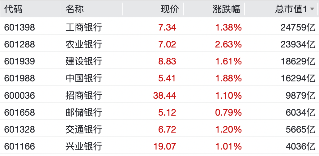 银行方面,农业银行、渝农商行、杭州银行涨超2%,工商银行、建设银行、中国银行、招商银行、邮储银行、交通银行纷纷上涨。