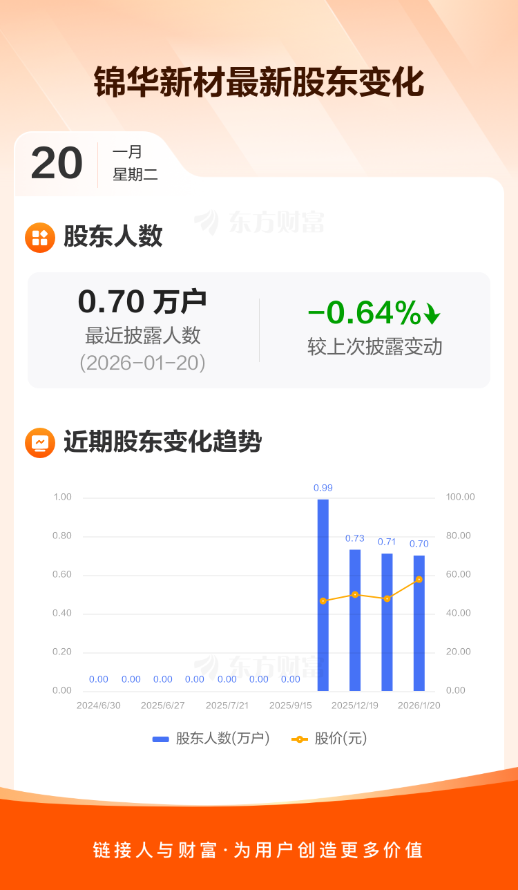 锦华新材最新披露数据显示,截至1月20日公司股东户数为7017户,较上期(2025年12月31日)减少45户,降幅为0.64%。户均持有流通股数量由上期的5344股上升至5379股,户均持股金额由上期的25.49万元增加至31.01万元。