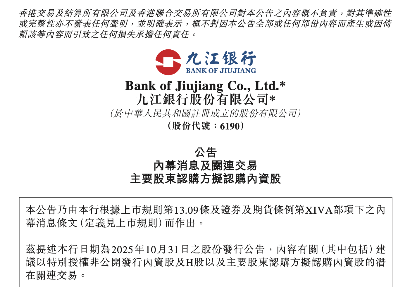 2025年10月份,九江银行发布公告表示,该行拟非公开发行不超过8.6亿股内资股及不超过1.75亿股H股,其中内资股的发行对象可能包括主要股东认购方。如上述股份均完成发行,九江银行的总股本将从28.47亿股增至38.82亿股,增幅约36%。